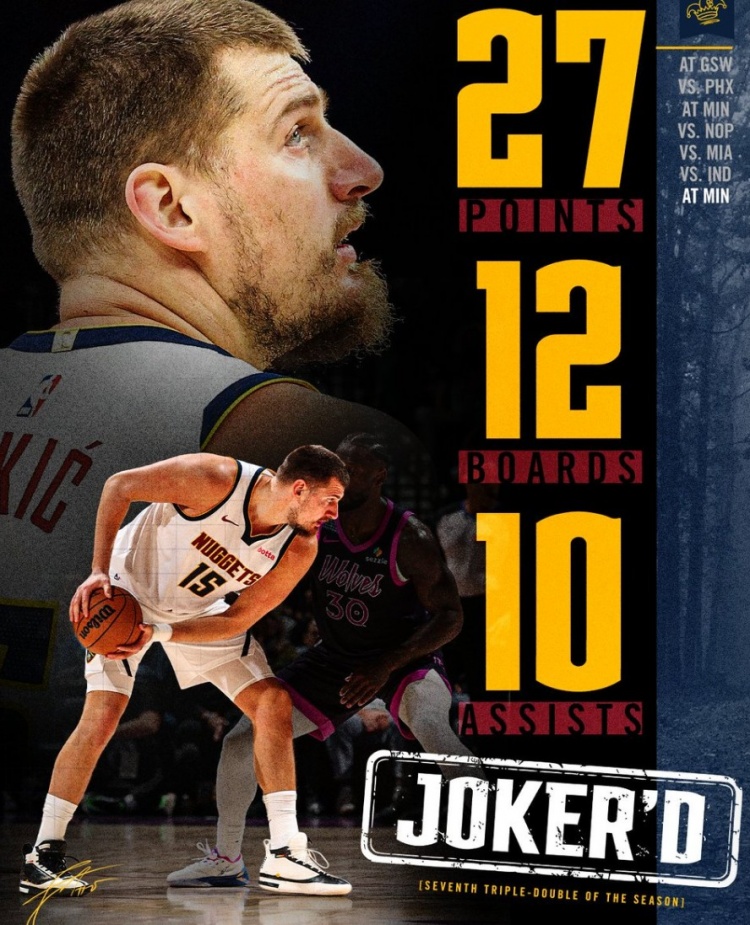 2025-11-16 16:09:59搞反了!掘金官方修正约基奇数据:27分12篮板10助攻