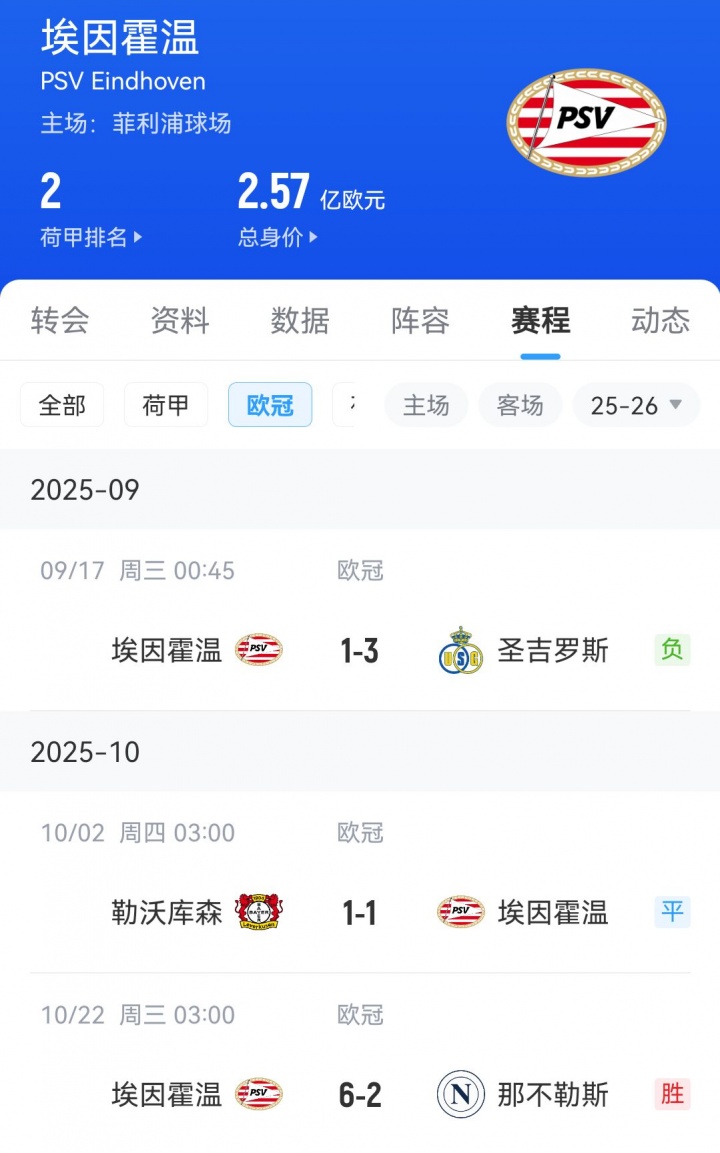 2025-10-22 16:02:02劫富济贫!埃因霍温欧冠大胜那不勒斯,前两轮不敌新军、客平药厂