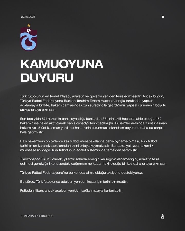 作为特拉布宗体育俱乐部,这再次证明了我们多年来的呼吁是多么合理,我们一直声明,球场上的努力没有得到回报,必须建立正义。