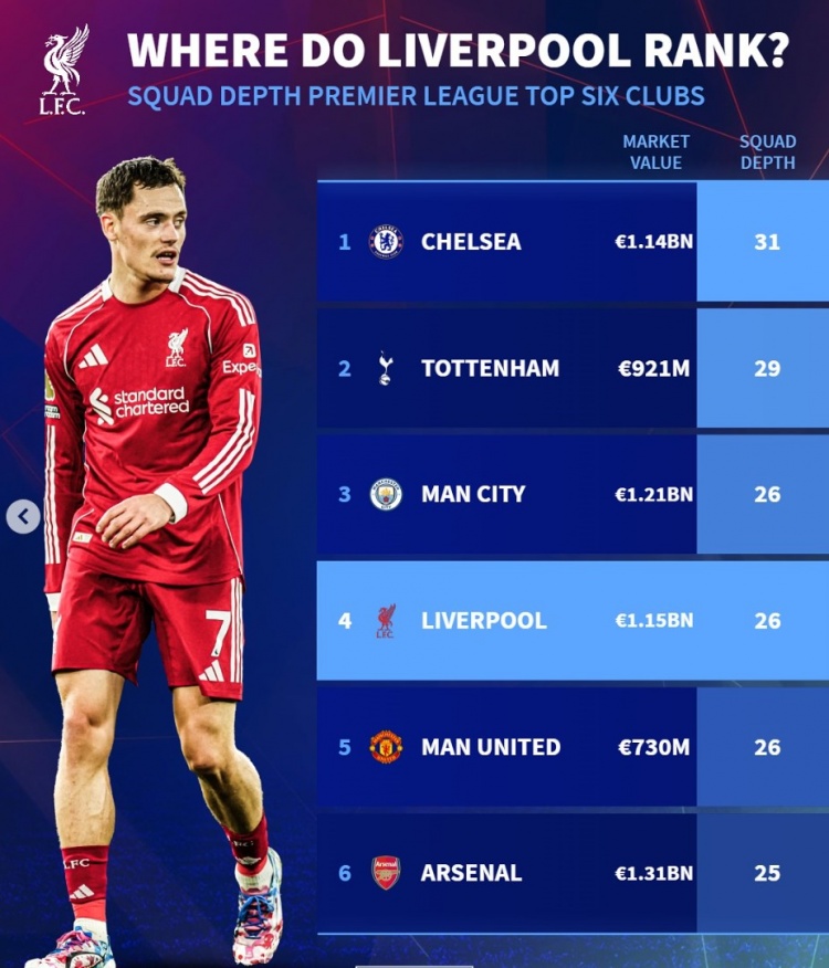 10月30日讯 利物浦在本轮联赛杯做出大轮换最终主场0-3完败水晶宫,斯洛特在赛后抱怨球队人手不足。《转会市场》则统计了BIG6的阵容深度情况。