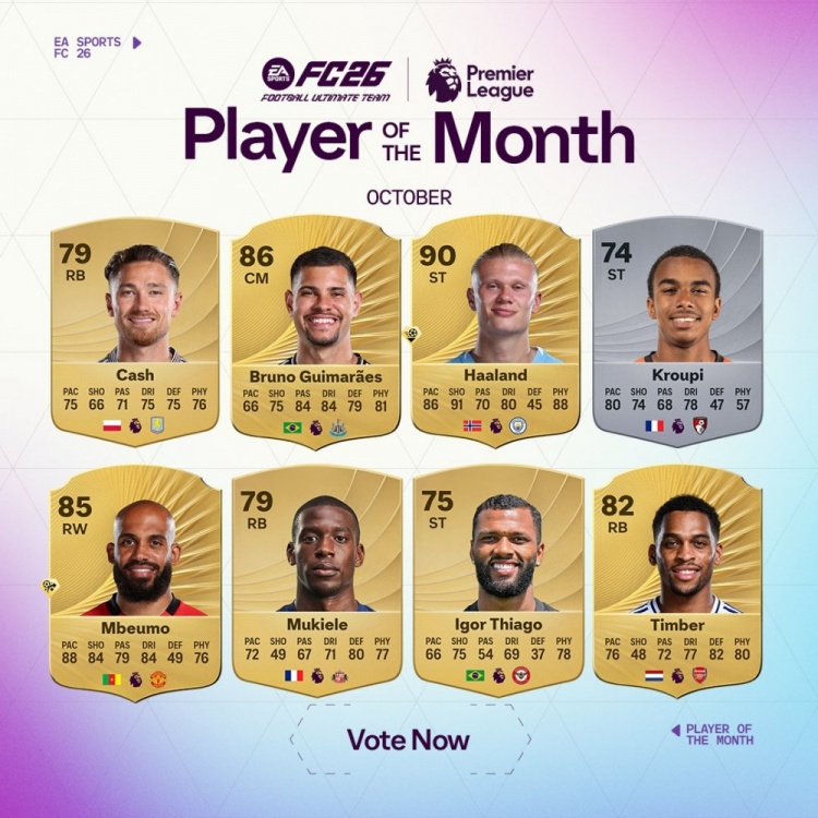 2025-10-31 01:20:15英超10月最佳8人候选名单:哈兰德、姆伯莫领衔,廷伯在列