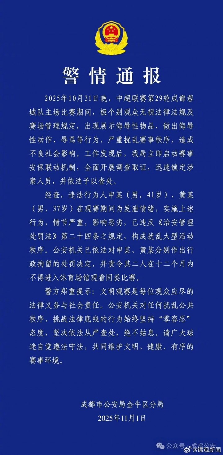 成都公安:2名球迷展示侮辱性物品、辱骂 被行政拘留+禁止观赛1年