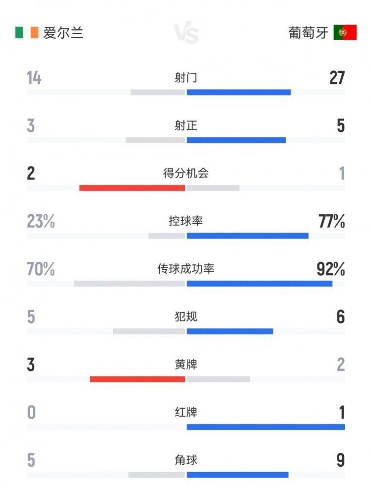 2025-11-14 08:01:32十人葡萄牙0-2爱尔兰数据:射门27-14射正5-3,控球率77%-23%